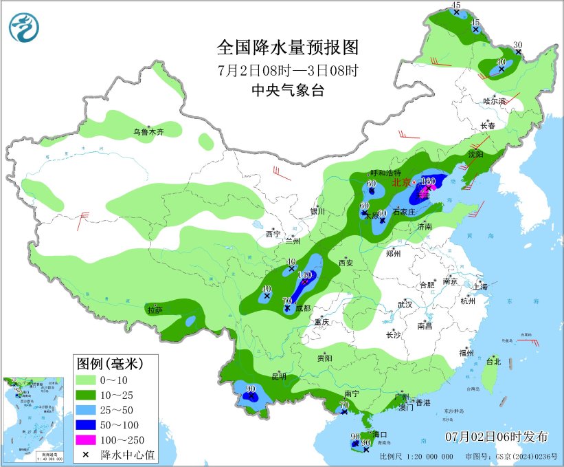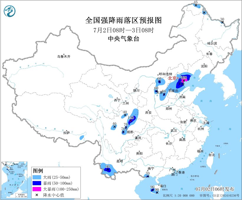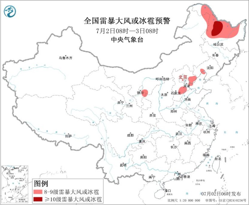 预计,7月2日08时至3日08时,山西中北部、河北中南部和东北部、北京大部、天津、山东北部、四川盆地西北部、甘肃东南部、陕西西南部、云南西南部、广西南部沿海、海南岛西南部、黑龙江西北部等地部分地区有大到暴雨,其中,河北东北部、天津中东部、四川盆地西北部等地局地有大暴雨(100~160毫米),上述部分地区伴有短时强降水(最大小时降雨量20~50毫米,局地可超过70毫米)(见图1)。此外,东北地区、华北东部等地的部分地区将有8级以上雷暴大风或冰雹天气,其中,黑龙江中西部等地的部分地区有10级以上雷暴大风,最大风力可达11级以上,黑龙江中西部等地的局地可能出现龙卷天气。预计,强对流的主要影响时段为今天午后至夜间(见图2)。中央气象台7月2日06时继续发布暴雨蓝色预警和强对流天气蓝色预警。