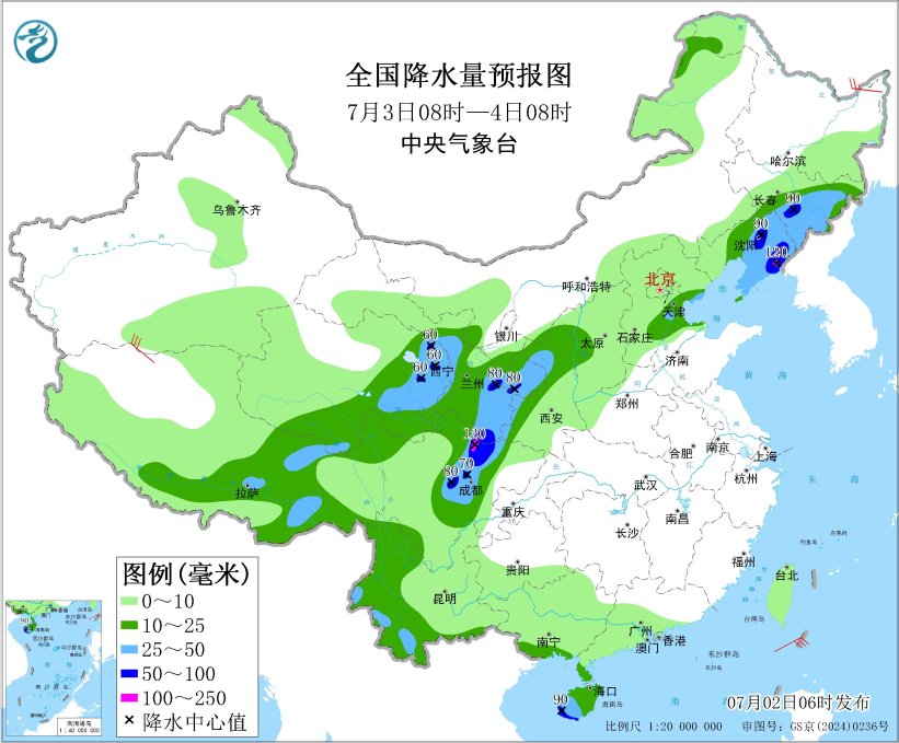 7月3日08时至4日08时,东北地区中南部、西北地区中东部、华北东部、四川盆地西部、云南西部和南部、广西南部沿海、海南岛、西藏中东部等地的部分地区有中到大雨,其中,吉林南部、辽宁中东部、青海东部、甘肃东部、四川盆地西北部、海南岛西南部等地局地有暴雨或大暴雨(100~120毫米)。黑龙江东部、新疆南疆盆地、内蒙古中部、辽宁大部、山东半岛等地的部分地区有4~6级风(见图4)。