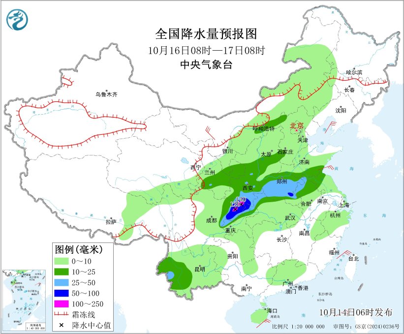 图1 全国降水量预报图(10月14日08时-15日08时)