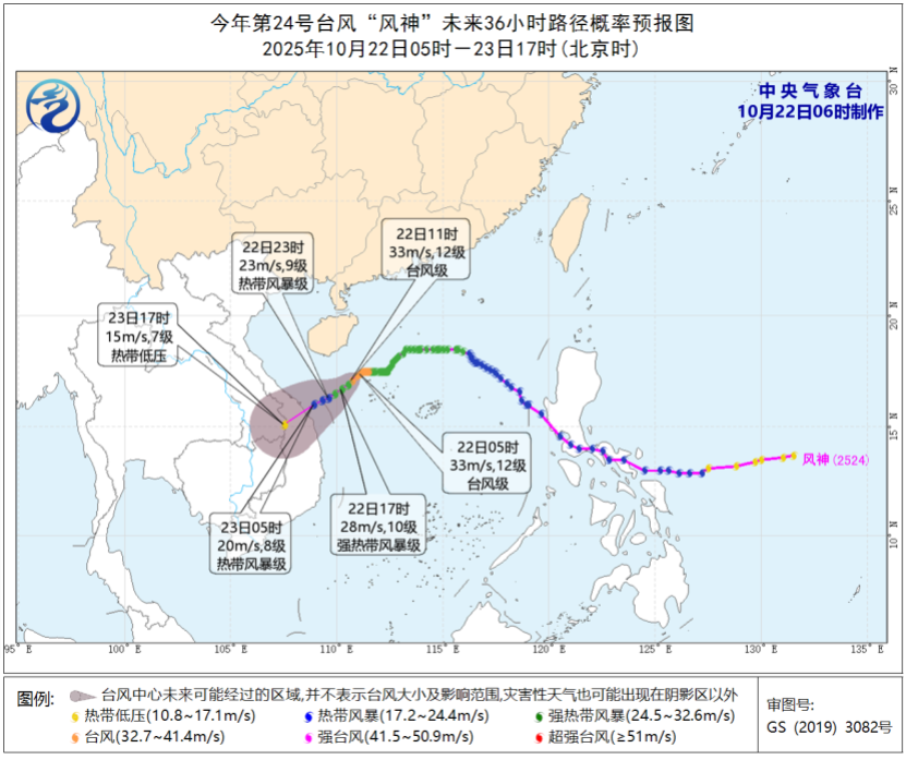 预计,“风神”将以每小时10~15公里的速度向西南方向移动,今天早晨至上午强度先维持,之后强度逐渐减弱,并将于23日白天以热带风暴级(18~23米/秒,8~9级)在越南中部沿海登陆,登陆后强度快速减弱(见图1)。中央气象台10月22日06时继续发布台风黄色预警。