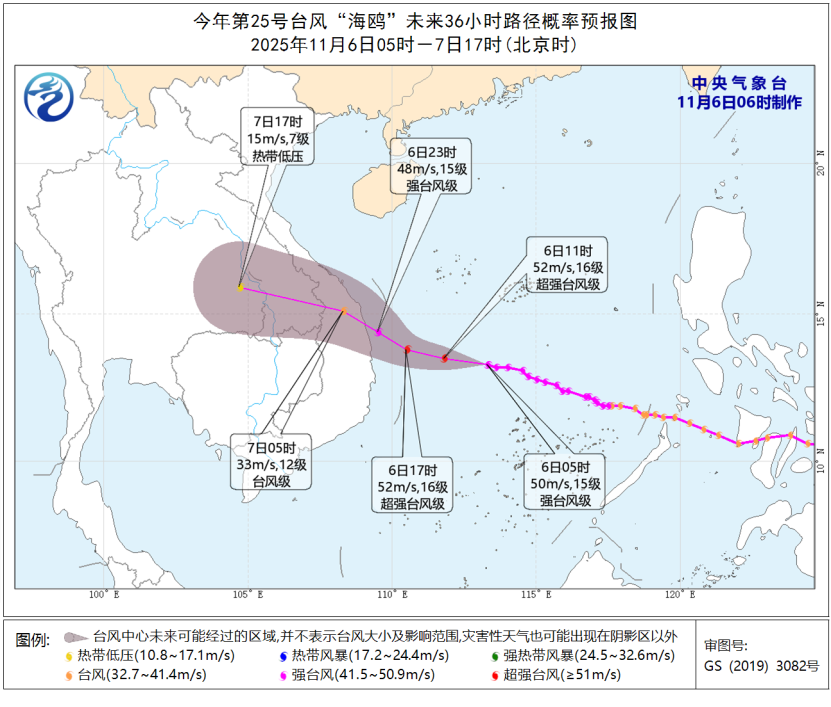 今年第25号台风“海鸥”(强台风级)的中心今天(6日)早晨5点钟位于越南嘉莱省归仁市偏东方向约440公里的南海西南部海面,中心附近最大风力有15级(50米/秒),中心最低气压为940百帕,七级风圈半径300~350公里,十级风圈半径150~160公里,十二级风圈半径70公里。“海鸥”将以每小时25~30公里的速度向西偏北方向移动,强度维持或略有增强,将于6日夜间在越南中部一带沿海登陆(40~45米/秒,13~14级,台风级或强台风级),之后强度逐渐减弱(见图1)。中央气象台11月6日06时继续发布台风黄色预警。