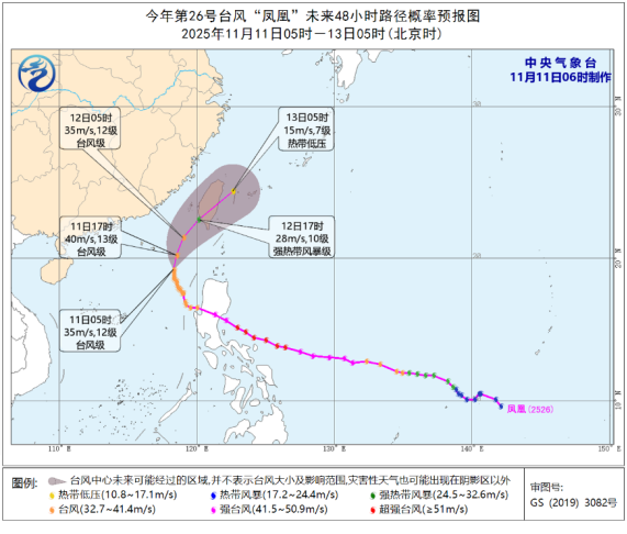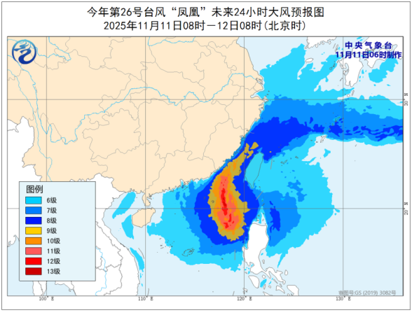 预计,11日至13日,受台风“凤凰”影响,南海东北部和中东部、台湾海峡、巴士海峡、东海南部风力可达9-11级,阵风12-13级,台风“凤凰”中心经过的附近海域风力12-13级,阵风14-15级;福建东部、台湾岛、浙江中东部等地有大到暴雨,局地大暴雨。