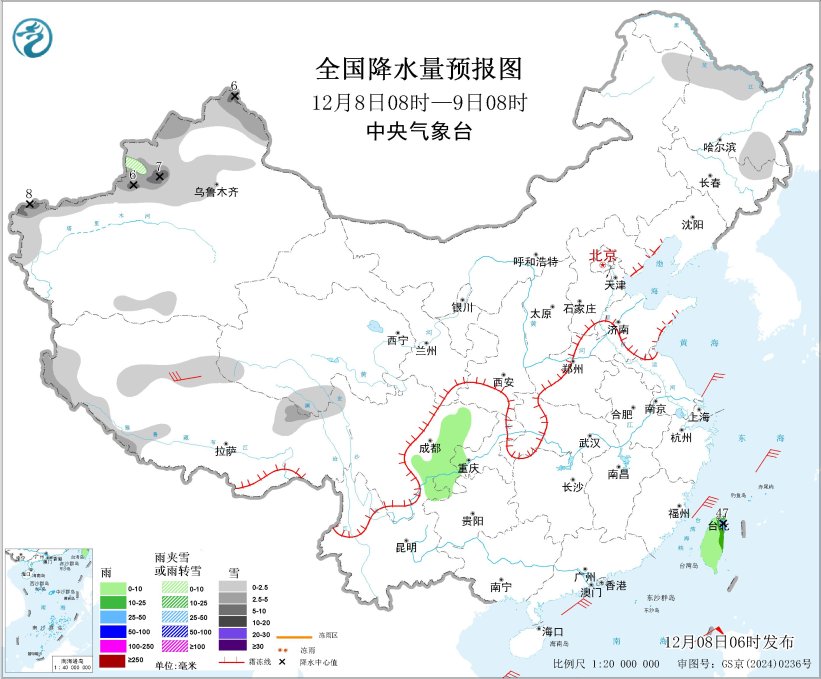 12月8日08时至9日08时,黑龙江北部和东南部、新疆北部、西藏中北部和西部、青海南部等地部分地区有小雪或雨夹雪,其中,新疆北疆北部和伊犁河谷等地部分地区有中到大雪(5~8毫米)。西南地区东北部、云南东北部、台湾岛等地部分地区有小到中雨,其中,台湾岛东北部局地有大雨(25~47毫米)。西藏中北部等地部分地区有4~6级风;东海西南部海域、台湾海峡、台湾以东洋面、巴士海峡、南海有6~7级风、阵风8~9级(见图1)。