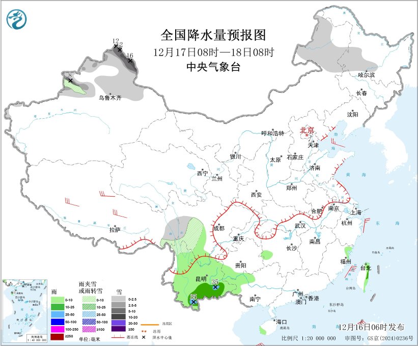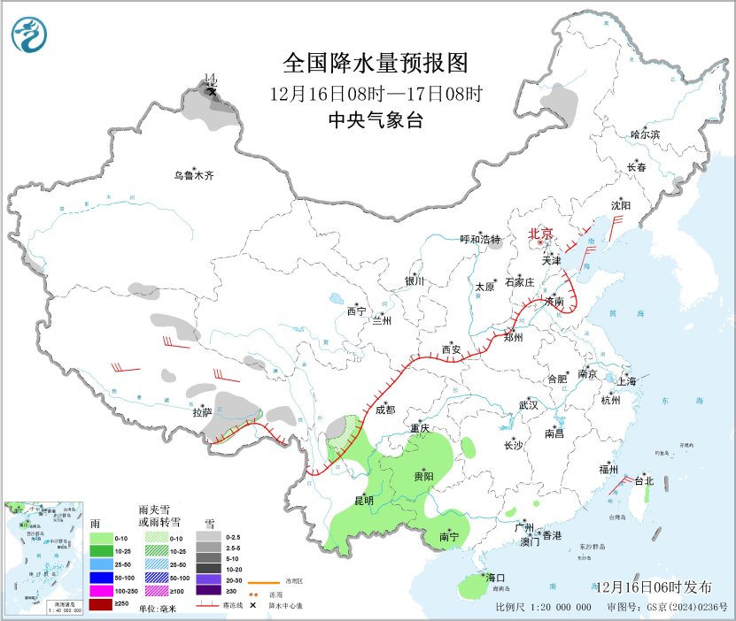 图1 全国降水量预报图(12月16日08时-17日08时)