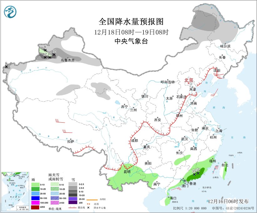 12月18日08时至19日08时,内蒙古东北部、黑龙江中北部、新疆北部和南疆西部山区、甘肃河西等地部分地区有小到中雪或雨夹雪,其中,新疆沿天山地区和伊犁河谷局地有大到暴雪(10~16毫米)。湖南南部、福建东部和南部、西南地区南部、广西西南部、广东东部和南部、海南岛东部、台湾岛东部等地部分地区有小到中雨,其中,广东东部局地有大雨(25~35毫米)。辽宁东部、西藏中北部等地部分地区有4~6级风;台湾海峡、巴士海峡、南海东北部和中东部海域将有5~7级大风、阵风8级(见图3)。