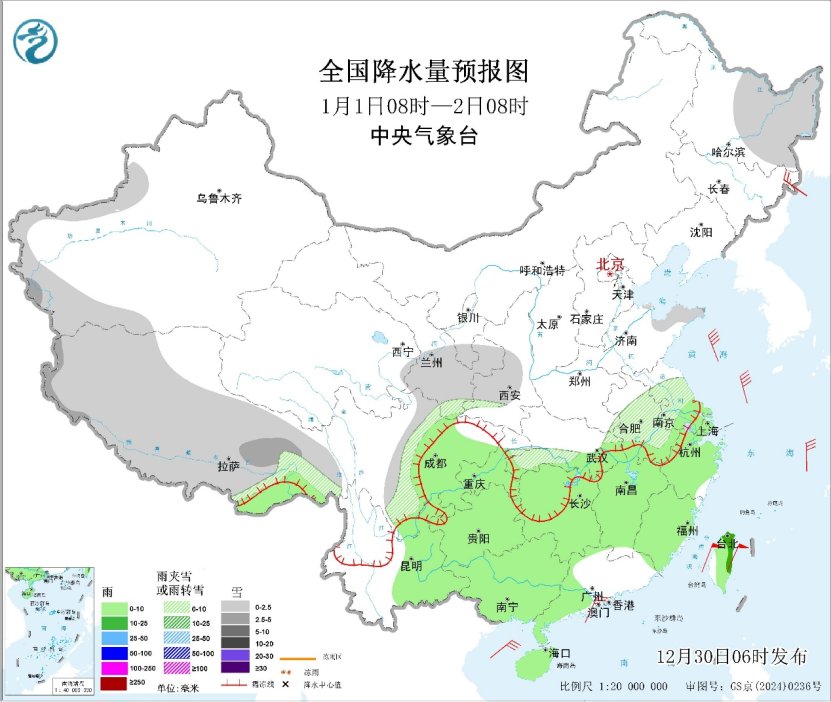 明天,雨雪天气进入最强时段,陕西、山西南部、河南中西部、湖北北部等地有大雪,局地暴雪(10~15毫米)。1月1日,雨雪范围东移南扩,强度减弱。