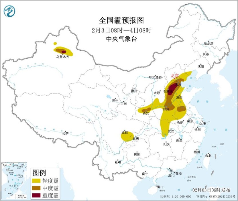 今晨,安徽南部、浙江北部、贵州西部、云南东部、新疆北疆等地部分地区出现大雾,局地出现能见度不足200米的强浓雾。3日至4日,华北中南部、黄淮中西部、汾渭平原、江汉等地的部分地区有轻至中度霾,其中,4日华北中南部局地重度霾。气象专家提醒,上述地区的公众外出时请做好个人健康防护,易感人群建议减少户外活动。