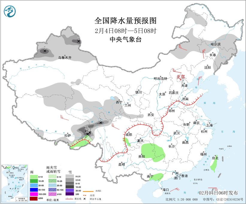 图2 全国降水量预报图(2月4日08时-5日08时)