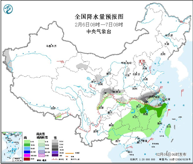 图3 全国降水量预报图(2月5日08时-6日08时)