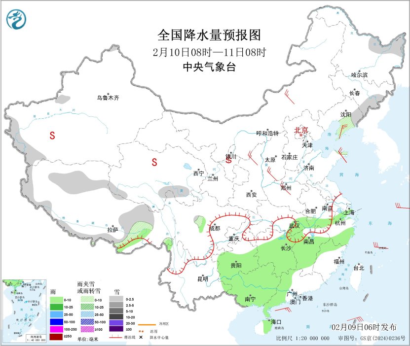 图2 全国降水量预报图(2月9日08时-10日08时)