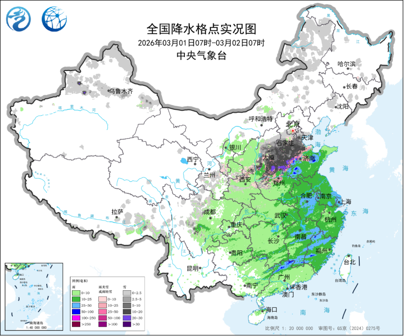 昨日,新疆北部、西北地区东部、华北南部及黄淮西北部等地部分地区出现小到中雪或雨夹雪,山西东南部、河北南部、河南北部等局地大雪或暴雪;黄淮中东部、江淮、江南中东部及广东北部等地出现中到大雨,浙江东北部沿海、江西南部、广东北部等局地暴雨。