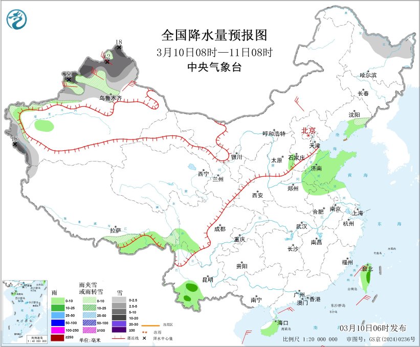 3月10日08时至11日08时,黑龙江东北部、新疆西北部和南疆西部山区、西藏西北部等地部分地区有小到中雪或雨夹雪,其中,新疆西北部和南疆西部山区等地部分地区有大到暴雪,局地大暴雪(20~22毫米)。辽东半岛、西藏东南部、山东、安徽北部、江苏北部、云南西南部、海南岛、台湾岛等地部分地区有小雨,局地有中雨。内蒙古中部、新疆西北部等地部分地区有4~6级风、阵风7~8级,新疆山口阵风可达10级以上;台湾海峡将有7~8级风、阵风9级,南海东北部海域将有6~7级风、阵风8级(见图1)。