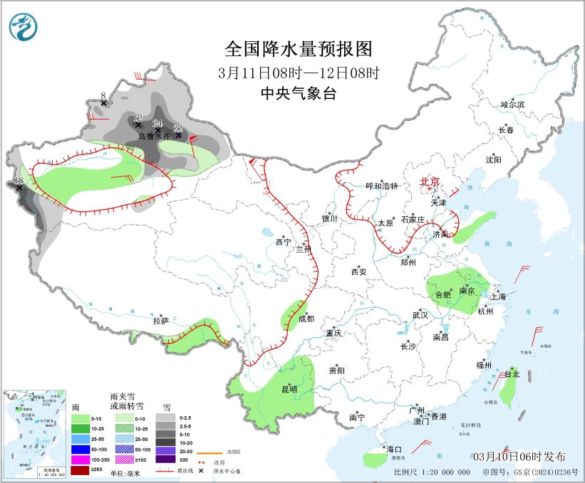 图1 全国降水量预报图(3月10日08时-11日08时)