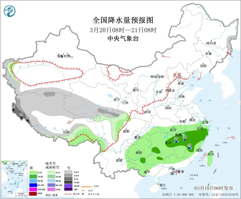3月20日08时至21日08时,新疆南疆高海拔山区、西藏西部和北部、青海南部、甘肃南部、川西高原等地部分地区有小雪或雨夹雪,其中,西藏西部等地部分地区有中到大雪,局地有暴雪(10~19毫米);西藏东南部、江汉东部、江南、西南地区东南部、华南北部和西部、台湾岛等地部分地区有小到中雨,其中,江西中部、福建西部等地部分地区有大雨(25~45毫米)。内蒙古中部、辽东半岛等地部分地区有4~6级风,西藏北部部分地区有6~7级风;东海南部、台湾海峡等海域有5~6级风,阵风7级(见图3)。