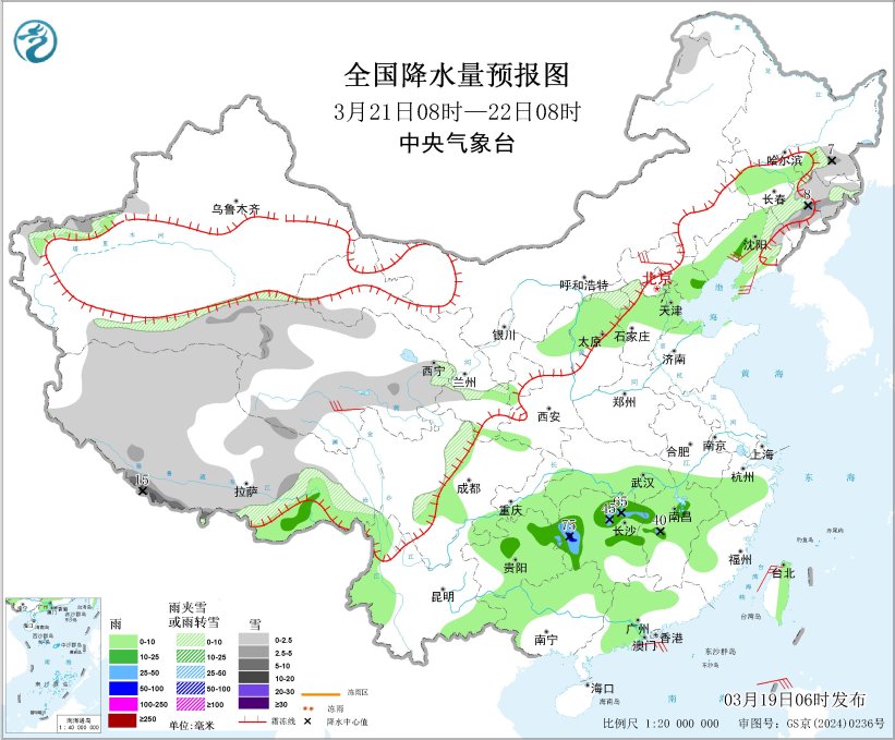 3月21日08时至22日08时,新疆南疆西部和南部山区、青海西部和中部、西藏大部、辽宁东部、吉林东部、黑龙江东南部等地部分地区有小到中雪或雨夹雪,其中,西藏西部、吉林东部、黑龙江东南部等地局地有大到暴雪(10~15毫米);西藏东南部、辽宁中部、贵州中北部、湖南中北部、江西西部等地部分地区有中到大雨,其中,湖南西部和东北部等地局地有暴雨(50~75毫米)。河北北部、辽宁中南部、青海南部等地部分地区有5~6级风;渤海、渤海海峡、台湾海峡等海域有5~6级风、阵风7级(见图3)。