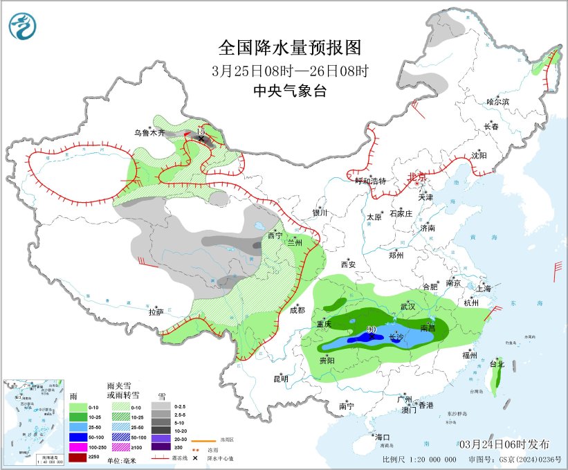 3月25日08时至26日08时,新疆东部、西藏东部、青海中南部和东部、川西高原等地部分地区有小雪或雨夹雪,其中,新疆东部、西藏东北部、青海东部等地部分地区有中到大雪,新疆东部等地局地暴雪(10~15毫米)。湖南中北部、江西中北部、重庆东南部、贵州东北部等地部分地区有中到大雨,其中,湖南中西部、贵州东北部等地部分地区有暴雨(50~90毫米)。内蒙古中西部、新疆北部和东部、西藏北部等地部分地区有4~6级风,其中,新疆东部部分地区有7~8级风(见图2)。