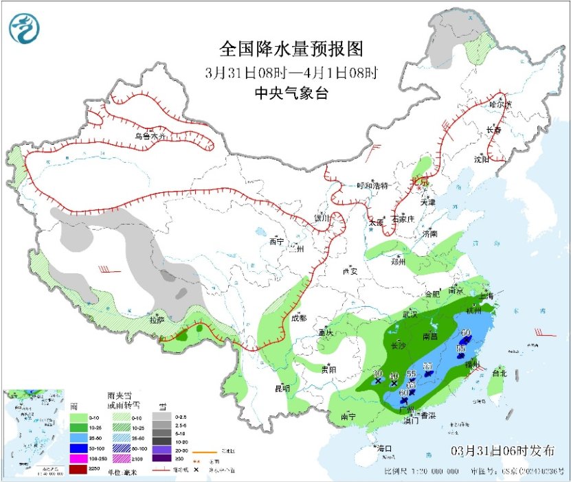 今日江南华南降雨较强局地有风雹。31日,南方地区降雨范围依然较广,其中湖南南部、江西南部和东部、浙江中南部、福建西部和北部、广西东北部、广东中北部等地部分地区将有大到暴雨,部分地区伴有短时强降水,局地有雷暴大风、冰雹等强对流天气。