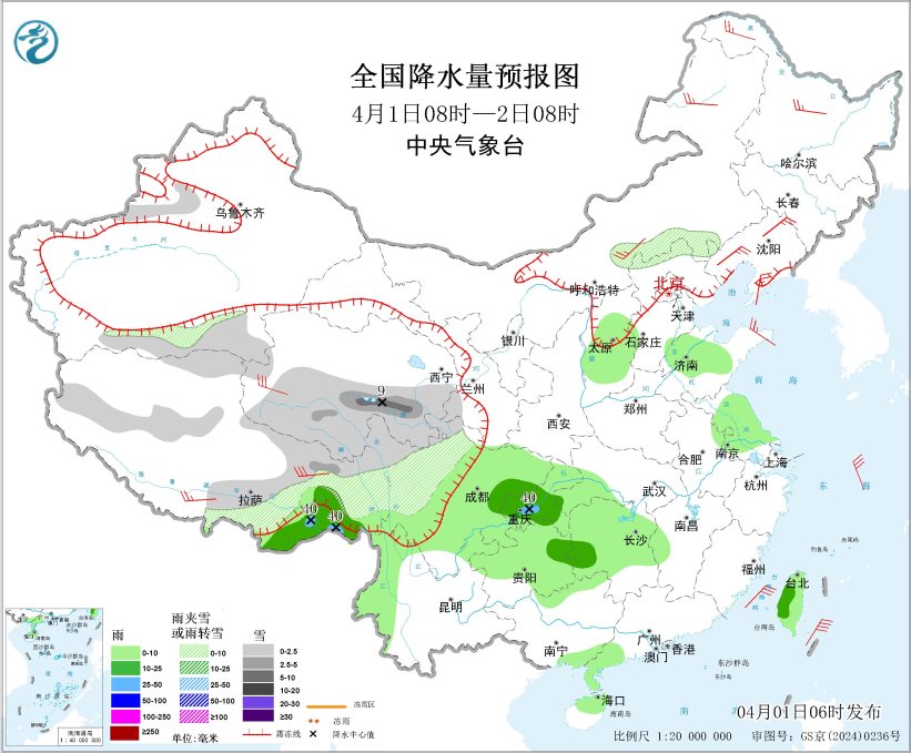 4月1日08时至2日08时,西藏东部和南部、青海南部和西部、川西高原北部、新疆南疆盆地、内蒙古东部、河北北部等地部分地区有小到中雪或雨夹雪,其中,青海南部等地局部地区有大雪(5~9毫米)。西藏东南部、西南地区东部、江南西部、山西中部、山东中北部、江苏大部、广西北部和东南部沿海、广东西南部、海南岛北部、台湾岛等地部分地区有小到中雨,其中,西藏东南部、重庆西南部等地局部地区有大雨(25~40毫米)。内蒙古中东部、黑龙江中北部、辽东半岛、山东半岛、西藏东部和南部、青海西部等地部分地区有4~6级风;渤海、东海大部海域、台湾海峡、台湾以东洋面、巴士海峡将有5~6级风、阵风7级(见图2)。