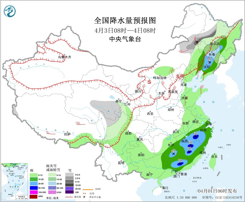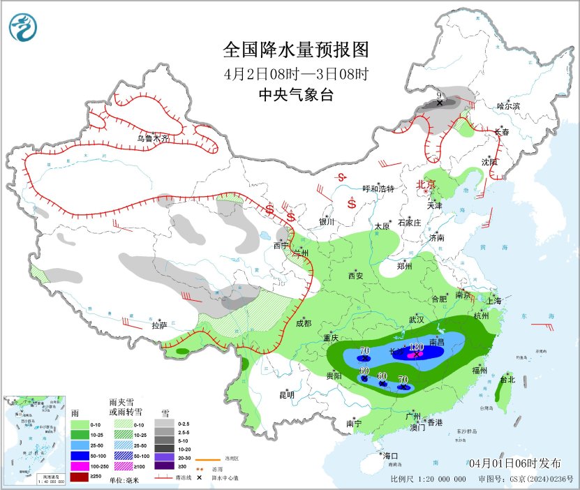 4月2日08时至3日08时,内蒙古东部、西藏东部、青海南部、甘肃河西、川西高原北部等地部分地区有小到中雪或雨夹雪,其中,内蒙古东部等地部分地区有大雪(5~9毫米)。江南大部、华南北部、贵州中东部等地部分地区有中到大雨,其中,贵州东部、湖南中部、江西中部、广东北部、广西东北部等地部分地区有暴雨或大暴雨(100~130毫米)。内蒙古大部、辽东半岛、山东半岛、江苏南部、西藏、甘肃河西等地部分地区有4~6级风,西藏东部部分地区有6~7级风;渤海、东海南部海域、台湾海峡、巴士海峡、北部湾将有5~6级风、阵风7级(见图3)。