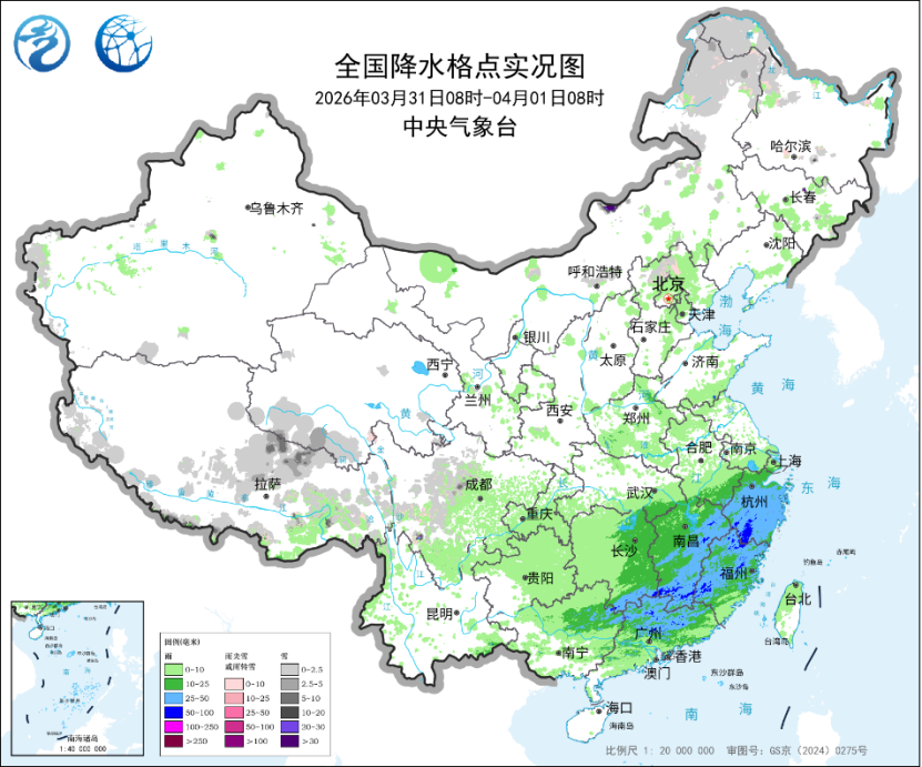 气象监测显示,昨日(3月31日),主要降雨区在江南、华南一带,浙江、江西东部和南部、福建、广东北部、湖南南部等地部分地区出现大雨或暴雨;上述部分地区伴有雷电和短时强降水,最大小时降雨量20~50毫米,广西、广东和福建等局地有8级以上大风。