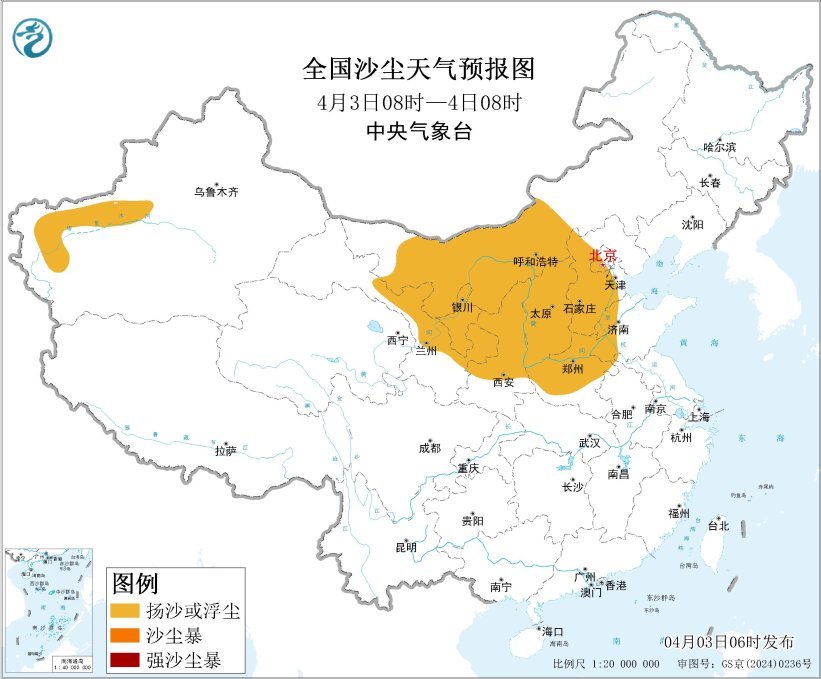 中央气象台4月3日06时继续发布大风黄色预警和沙尘暴蓝色预警。预计,4月3日08时至4日08时,受蒙古气旋影响,内蒙古中东部、陕西中北部、山西大部、河北、北京、天津、河南北部、山东北部、辽宁大部等地部分地区有5~7级大风,阵风8~10级。受冷空气和对流共同作用影响,辽宁西部、河北东部、天津、山东北部、广西南部、广东北部等地局地有10~11级雷暴大风。渤海、渤海海峡、黄海北部海域、东海大部海域将有8~9级、阵风10~11级的大风(见图1);新疆南部、内蒙古中西部、甘肃中东部和河西、宁夏、陕西中北部、山西、北京西南部、天津西部、河北中南部、河南中北部、山东西部等地的部分地区有扬沙或浮尘天气(见图2)。