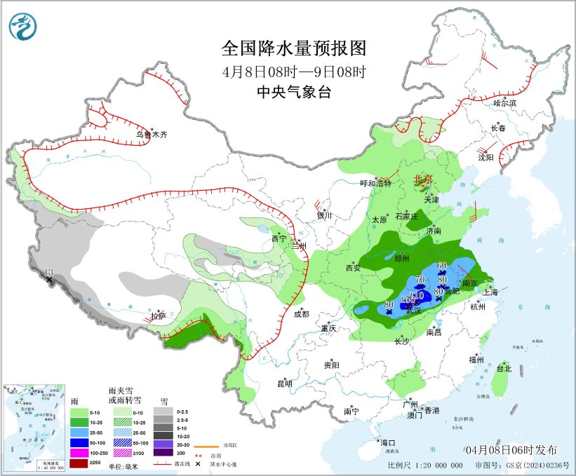 4月8日08时至9日08时,新疆南疆西部山区、西藏西部和南部、青海东部和南部、川西高原北部、内蒙古东南部等地部分地区有小到中雪或雨夹雪,其中,西藏西部局地有暴雪(10~13毫米);西藏东南部、山西南部、河北南部、北京西部和南部、河南大部、山东南部、江汉大部、江淮大部等地部分地区有中到大雨,其中,河南南部、安徽中部、湖北南部和东部等地部分地区有暴雨或大暴雨(100~150毫米)。新疆东部和南疆盆地、内蒙古、甘肃东部、宁夏北部、吉林中西部、辽宁北部以及西藏大部、川西高原、云南、贵州等地部分地区有5~7级风,阵风8~9级;黄海中部和南部海域、东海西北部海域有7级风,阵风8级(见图5)。