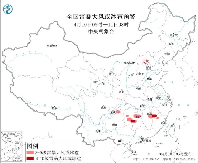 中央气象台4月10日06时继续发布暴雨蓝色预警和强对流天气蓝色预警。预计,4月10日08时至11日08时,湖北南部、湖南中北部、江西中北部、福建西北部、重庆中部、贵州东北部、四川中部等地部分地区有大到暴雨,其中,湖南中部等地部分地区有大暴雨(100~110毫米)(见图1)。江南中部等地的部分地区将有8级以上雷暴大风或冰雹天气,其中,湖南中南部、江西中东部、福建西北部等地的部分地区将有10级以上雷暴大风,最大风力可达11级以上;江南中部、西南地区东北部等地的部分地区将有小时雨量大于20毫米的短时强降水天气,其中,湖南中部的部分地区小时雨量大于50毫米(见图2)。