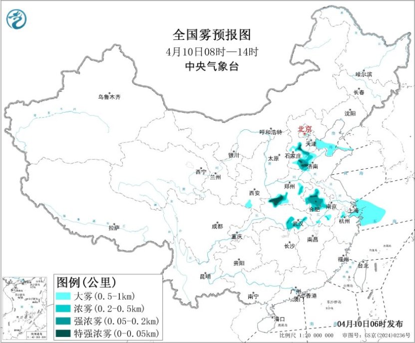 中央气象台4月10日06时继续发布大雾黄色预警。预计,10日早晨至上午,渤海南部海域、渤海海峡南部海域、东海西北部海域、成山头附近海域、长江口附近海域将有能见度不足1公里的大雾。此外,河北南部、山东西北部、河南西南部、安徽中部、湖北西北部和东南部等地的部分地区有大雾天气,局地有能见度不足200米的强浓雾(见图4)。
