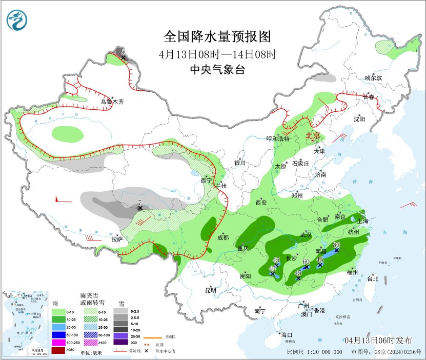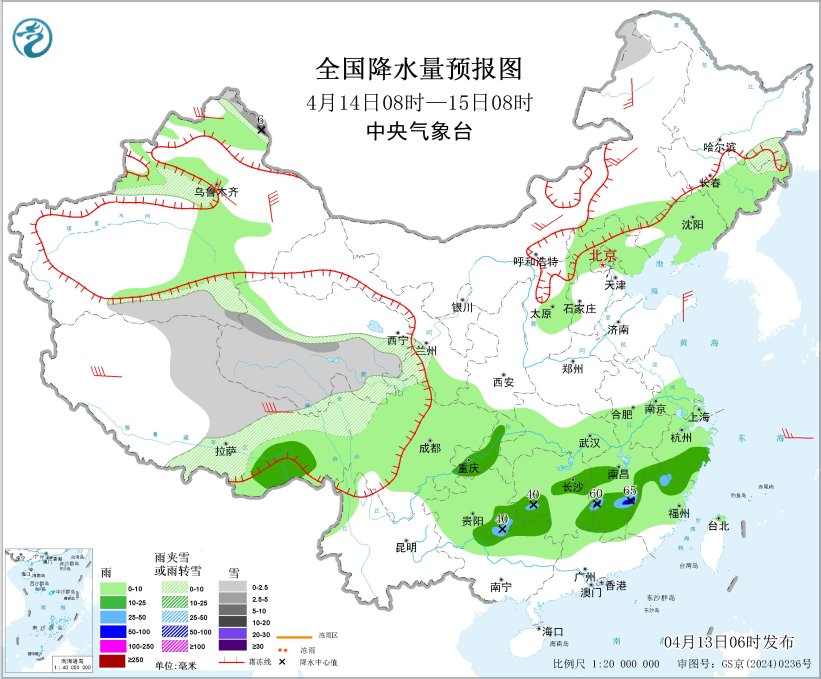 4月13日08时至14日08时,新疆阿勒泰北部和南疆盆地、西藏北部、青海东部和南部、甘肃河西和南部、川西高原北部以及内蒙古中部、黑龙江北部等地部分地区有小雪或雨夹雪,其中,新疆阿勒泰北部、西藏北部、青海西南部等地部分地区有中到大雪(5~9毫米);西藏东南部、四川盆地西部、西南地区东北部、江南大部、湖北南部、广西北部等地部分地区有中到大雨,其中,湖南东南部、江西东北部等地局地有暴雨(50~80毫米)。内蒙古中部有4~6级风,西藏部分地区有7~8级风(见图2)。