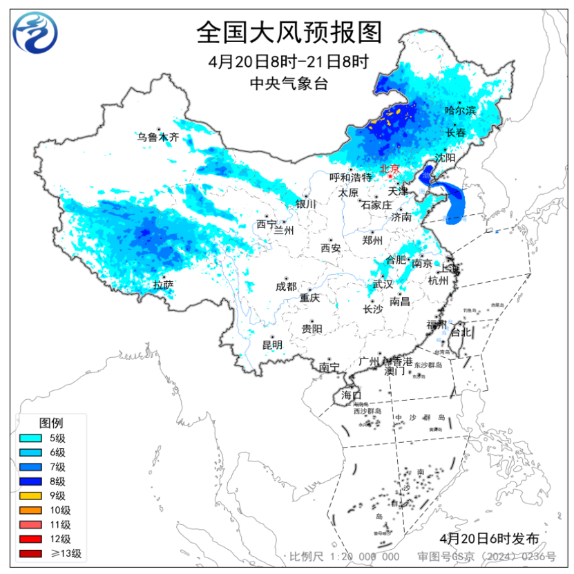 预计,4月20日08时至21日08时,新疆沿天山地区和南疆盆地、西藏大部、青海大部、甘肃河西、内蒙古中东部、东北地区大部、河北北部、北京、天津、山东半岛、苏皖大部、湖北东部等地部分地区有5~7级风,阵风8~9级,其中新疆东部山口、西藏北部、内蒙古中部局地有8~9级风,阵风10级以上;渤海、渤海海峡、黄海北部海域、黄海中西部和西南部部分海域将有7~8级、阵风9级的大风(见图2)。中央气象台4月20日06时继续发布大风黄色预警。