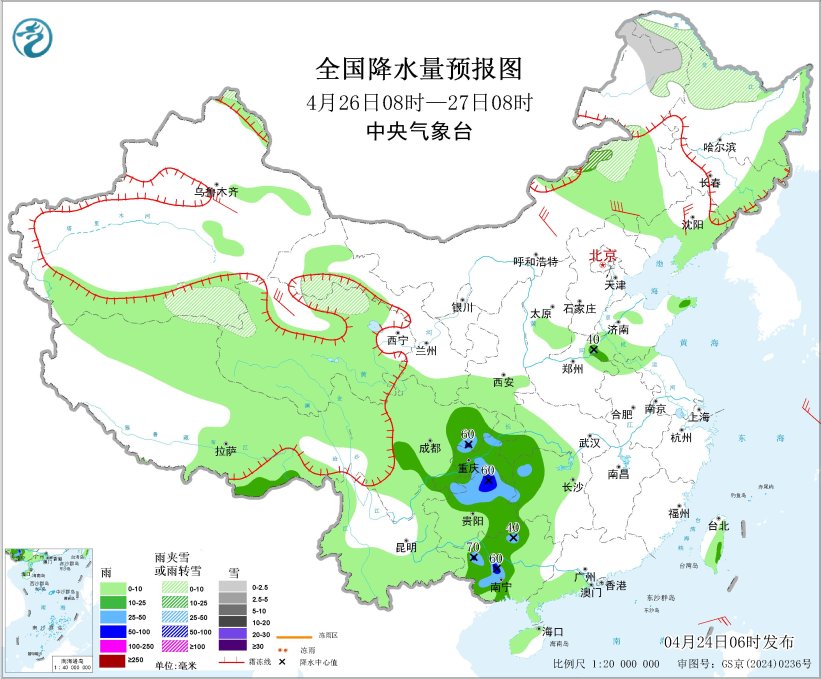 4月26日08时至27日08时,内蒙古东北部、黑龙江西北部、青海北部、甘肃祁连山等地部分地区有小雪或雨夹雪;西南地区东部、湖北西南部、湖南西部、广西中西部、山东西南部等地部分地区有中到大雨,其中,广西中部、贵州东北部、四川东部等地部分地区有暴雨(50~70毫米)。内蒙古中部、辽宁中部、新疆沿天山地区、青海西部等地部分地区有5~6级风(见图3)。