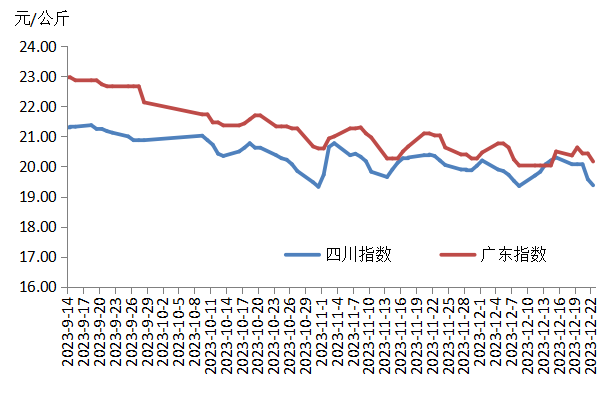 本周,四川猪肉周均价为每公斤19.84元,环比下跌0.9%,同比下跌16.0%,较上周收窄8.7个百分点。散养户出栏积极,批发市场到货量提升,而低价小规格(宰后均重在80公斤以下)白条猪肉仍存,生猪及猪肉供应充沛。腌腊、灌香肠活动对终端消费有一定提振,但消费者对高价猪肉的采购量较少,猪肉价格略微低于上周。