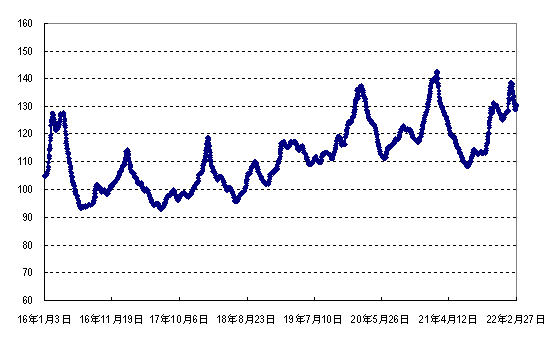 据农业农村部监测,2022年第8周(2022年2月21日—2022年2月27日,下同)“农产品批发价格200指数”为129.72(以2015年为100),比前一周降1.42个点;“‘菜篮子’产品批发价格200指数”为132.43(以2015年为100),比前一周降1.61个点。