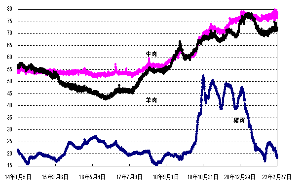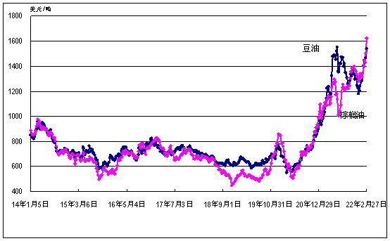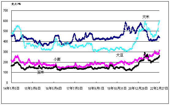 美国芝加哥商品交易所小麦、豆油、玉米和大豆最近期货合约收盘周均价每吨分别为315美元、1539美元、265美元和600美元,环比分别涨8%、5%、4%和3%,同比分别高29%、39%、21%和16%;马来西亚棕榈油荷兰鹿特丹港到岸周均价每吨1622美元,环比涨8%,同比高46%;国际糖料理事会原糖周均价每磅17.91美分(每吨395美元),环比涨1%,同比高4%。