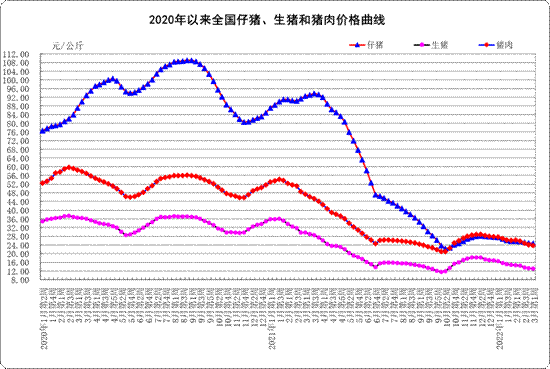 生猪产品价格。全国仔猪平均价格24.79元/公斤,比前一周下降0.5%,同比下降73.2%。宁夏、新疆、安徽、江苏陕西等8个省份仔猪价格上涨,广东、广西、山东、湖南、青海等20个省份价格下降,上海价格持平。华中地区仔猪平均价格较高,为26.57元/公斤;西南地区较低,为22.34元/公斤。全国生猪平均价格13.21元/公斤,比前一周下降0.9%,同比下降55.7%。海南、陕西、上海、新疆、北京等9个省份生猪价格上涨,内蒙古、宁夏、湖北、青海、云南等19个省份价格下降,天津、山西价格持平。华南地区生猪平均价格较高,为15.91元/公斤;东北地区较低,为12.37元/公斤。全国猪肉平均价格23.71元/公斤,比前一周下降1.9%,同比下降50.0%。海南、新疆、上海等3个省份猪肉价格上涨,宁夏、北京、重庆、陕西、内蒙古等25个省份猪肉价格下降,天津、吉林价格持平。华南地区猪肉平均价格较高,为29.34元/公斤;东北地区较低,为19.36元/公斤。
