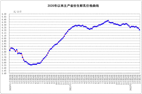 生鲜乳价格。内蒙古、河北等10个主产省份生鲜乳平均价格4.21元/公斤,比前一周下降0.7%,同比下降1.9%。