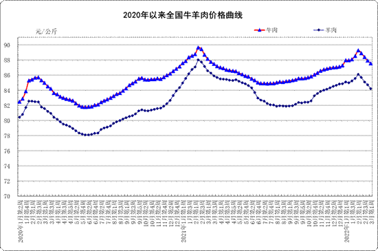 牛羊肉价格。全国牛肉平均价格87.58元/公斤,比前一周下降0.4%,同比下降0.7%。河北、辽宁、吉林、山东和河南等主产省份牛肉平均价格79.35元/公斤,与前一周持平。全国羊肉平均价格84.24元/公斤,比前一周下降0.6%,同比下降2.7%。河北、内蒙古、山东、河南和新疆等主产省份羊肉平均价格78.53元/公斤,比前一周下降0.5%。