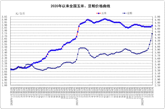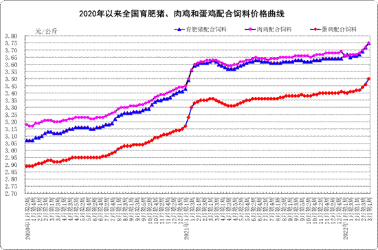 饲料价格。全国玉米平均价格2.89元/公斤,比前一周上涨0.7%,同比下降3.3%。主产区东北三省玉米平均价格为2.60元/公斤,比前一周上涨1.2%。主销区广东省玉米价格3.09元/公斤,比前一周上涨1.3%。全国豆粕平均价格4.43元/公斤,比前一周上涨5.5%,同比上涨13.3%。育肥猪配合饲料平均价格3.75元/公斤,比前一周上涨0.8%,同比上涨3.6%。肉鸡配合饲料平均价格3.75元/公斤,比前一周上涨0.8%,同比上涨3.3%。蛋鸡配合饲料平均价格3.50元/公斤,比前一周上涨1.2%,同比上涨4.2%。