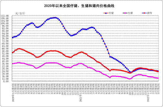 生猪产品价格。全国仔猪平均价格24.48元/公斤,比前一周下降1.3%,同比下降73.7%。宁夏、贵州、山东、山西、辽宁、新疆等6个省份仔猪价格上涨,青海、湖北、广东、江苏、重庆等23个省份价格下降。西北地区仔猪平均价格较高,为26.16元/公斤;西南地区较低,为22.11元/公斤。全国生猪平均价格12.88元/公斤,比前一周下降2.5%,同比下降55.7%。新疆生猪价格上涨,青海、内蒙古、广东、宁夏、广西等29个省份价格下降。华南地区生猪平均价格较高,为15.53元/公斤;西北地区较低,为11.96元/公斤。全国猪肉平均价格23.13元/公斤,比前一周下降2.4%,同比下降50.0%。全国30个监测省份猪肉价格均下降。华南地区猪肉平均价格较高,为28.81元/公斤;东北地区较低,为18.97元/公斤。