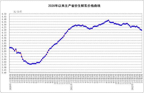 生鲜乳价格。内蒙古、河北等10个主产省份生鲜乳平均价格4.20元/公斤,比前一周下降0.2%,同比下降1.9%。