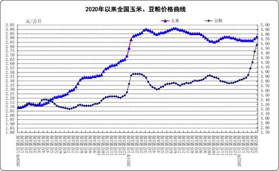 饲料价格。全国玉米平均价格2.91元/公斤,比前一周上涨0.7%,同比下降3.0%。主产区东北三省玉米平均价格为2.63元/公斤,比前一周上涨1.2%。主销区广东省玉米价格3.10元/公斤,比前一周上涨0.3%。全国豆粕平均价格4.57元/公斤,比前一周上涨3.2%,同比上涨18.1%。育肥猪配合饲料平均价格3.79元/公斤,比前一周上涨1.1%,同比上涨4.4%。肉鸡配合饲料平均价格3.78元/公斤,比前一周上涨0.8%,同比上涨4.1%。蛋鸡配合饲料平均价格3.52元/公斤,比前一周上涨0.6%,同比上涨4.8%。