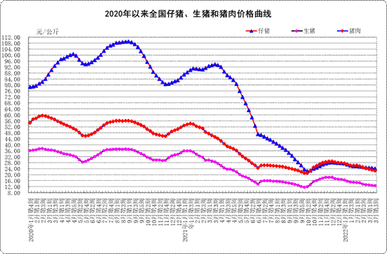 生猪产品价格。全国仔猪平均价格24.16元/公斤,比前一周下降1.3%,同比下降74.3%。宁夏、贵州、河北、海南、浙江、四川等6个省份仔猪价格上涨,青海、江西、天津、辽宁、山西等23个省份价格下降。西北地区仔猪平均价格较高,为25.70元/公斤;西南地区较低,为22.00元/公斤。全国生猪平均价格12.62元/公斤,比前一周下降2.0%,同比下降55.7%。北京、天津、吉林等3个省份生猪价格上涨,内蒙古、青海、广西、江西、湖北等27个省份价格下降。华南地区生猪平均价格较高,为15.17元/公斤;西北地区较低,为11.71元/公斤。全国猪肉平均价格22.65元/公斤,比前一周下降2.1%,同比下降50.0%。吉林、上海、新疆等3个省份猪肉价格上涨,内蒙古、青海、安徽、江西、湖南等27个省份价格下降。华南地区猪肉平均价格较高,为28.00元/公斤;东北地区较低,为18.89元/公斤。