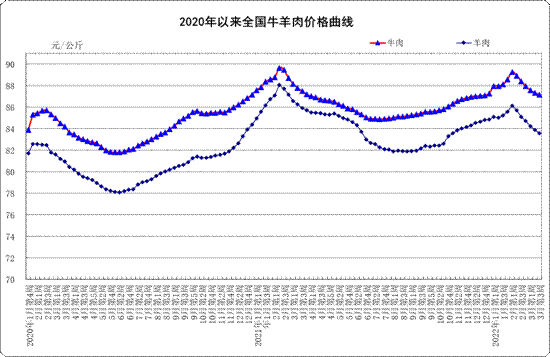 牛羊肉价格。全国牛肉平均价格87.16元/公斤,比前一周下降0.2%,同比下降0.4%。河北、辽宁、吉林、山东和河南等主产省份牛肉平均价格79.32元/公斤,与前一周基本持平。全国羊肉平均价格83.56元/公斤,比前一周下降0.4%,同比下降2.7%。河北、内蒙古、山东、河南和新疆等主产省份羊肉平均价格78.20元/公斤,比前一周下降0.2%。