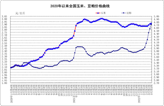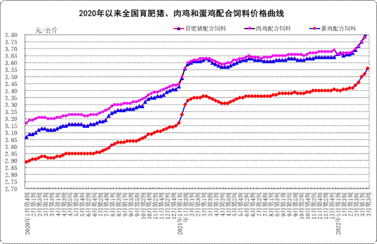 饲料价格。全国玉米平均价格2.92元/公斤,比前一周上涨0.3%,同比下降2.3%。主产区东北三省玉米平均价格为2.64元/公斤,比前一周上涨0.4%。主销区广东省玉米价格3.11元/公斤,比前一周上涨0.3%。全国豆粕平均价格4.72元/公斤,比前一周上涨3.3%,同比上涨24.9%。育肥猪配合饲料平均价格3.81元/公斤,比前一周上涨0.5%,同比上涨5.2%。肉鸡配合饲料平均价格3.81元/公斤,比前一周上涨0.8%,同比上涨5.0%。蛋鸡配合饲料平均价格3.56元/公斤,比前一周上涨1.1%,同比上涨6.3%。