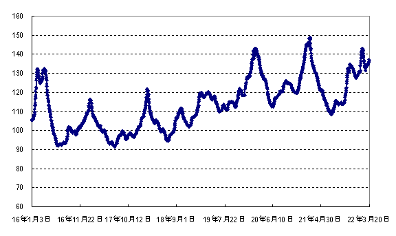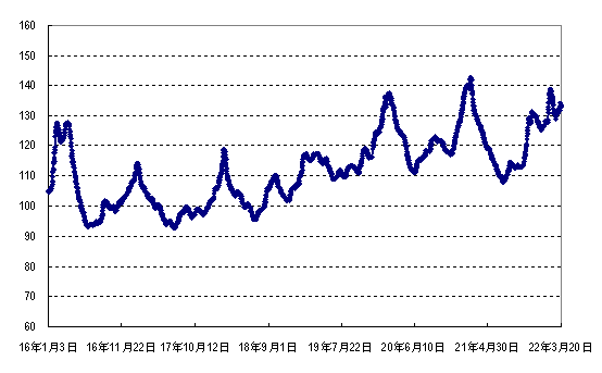 据我司监测,2022年第11周(2022年3月14日—2022年3月20日,下同)“农产品批发价格200指数”为133.16(以2015年为100),比前一周升1.41个点,比上年同期高5.37个点;“‘菜篮子’产品批发价格200指数”为136.01(以2015年为100),比前一周升1.52个点,比上年同期高4.75个点。