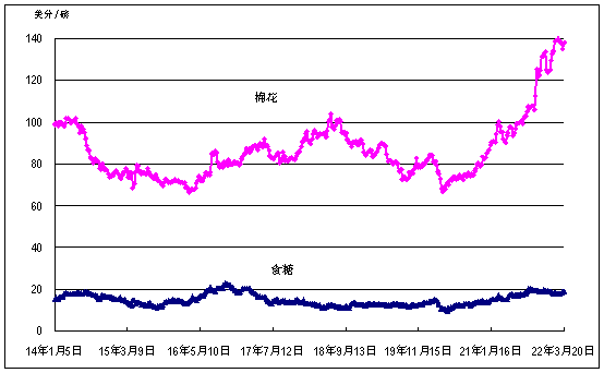 国际棉花指数(SM级)每磅138.21美分(每吨3047美元),环比涨2%,同比高45%。