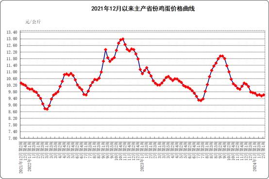 家禽产品价格。全国鸡蛋平均价格10.96元/公斤,比前一周上涨0.2%,同比下跌8.6%。河北、辽宁等10个主产省份鸡蛋价格9.61元/公斤,比前一周上涨0.6%,同比下跌10.6%。全国鸡肉平均价格23.98元/公斤,比前一周上涨0.6%,同比下跌3.6%。商品代蛋雏鸡平均价格3.65元/只,比前一周上涨0.3%,同比下跌5.7%。商品代肉雏鸡平均价格3.41元/只,比前一周上涨2.7%,同比下跌4.2%。