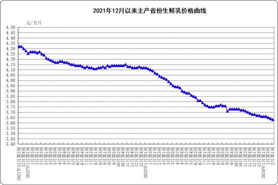 生鲜乳价格。内蒙古、河北等10个主产省份生鲜乳平均价格3.63元/公斤,比前一周下跌0.3%,同比下跌10.8%。