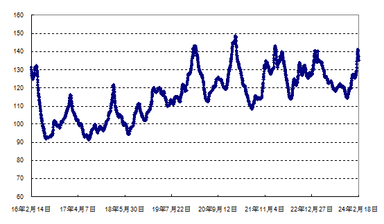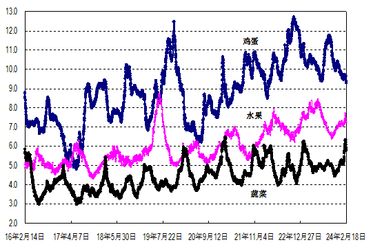 据农业农村部监测,2024年第7周(2024年2月12日—2月18日,下同)“农产品批发价格200指数”为135.95(以2015年为100),比前一周降1.30个点,同比高3.83个点;“‘菜篮子’产品批发价格200指数”为138.74(以2015年为100),比前一周降1.51个点,同比高4.15个点。