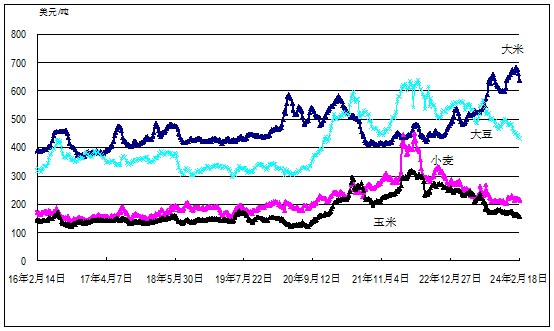 国际大宗农产品周均价格走势图(2016年2月至今)
